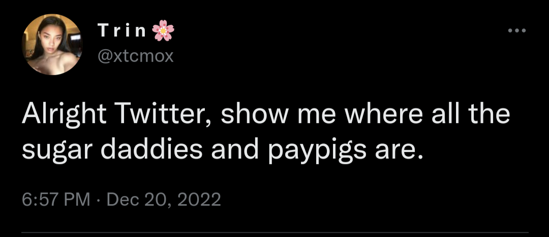 | {{{"She graduated and now is looking for a sugar daddy on Twitter:o" | renderPostMessage 48308}}} |