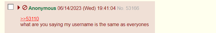 | {{{">>53110\nwhat are you saying my username is the same as everyones" | renderPostMessage 53166}}} |